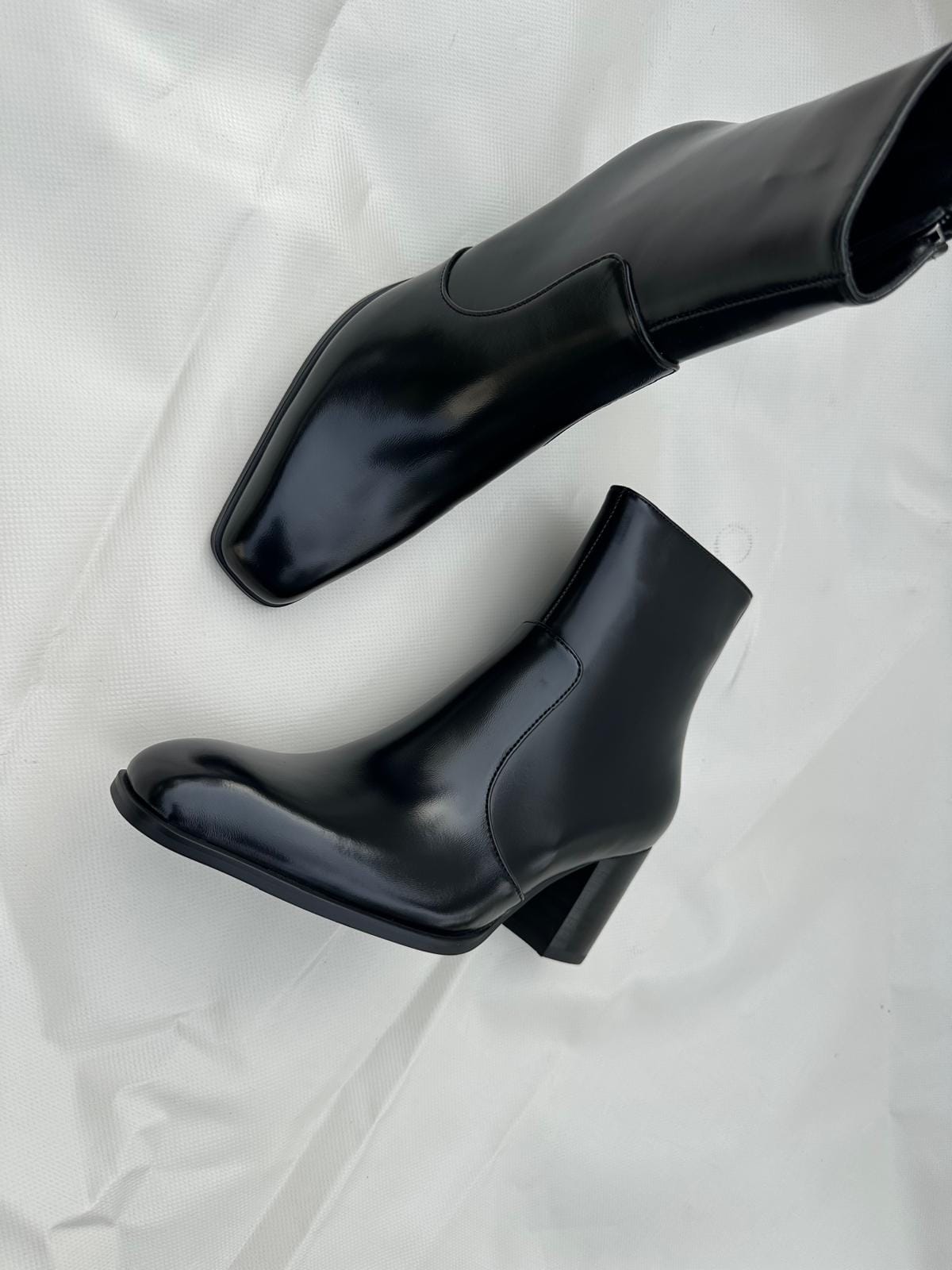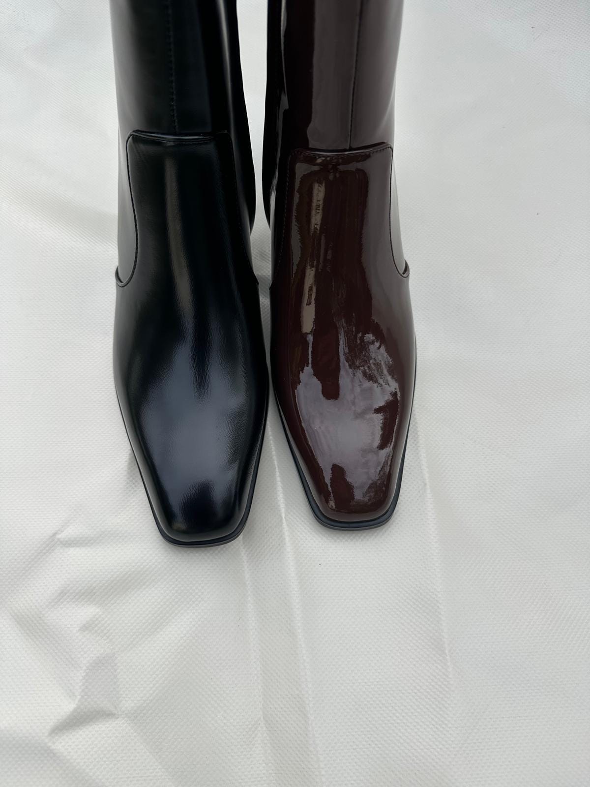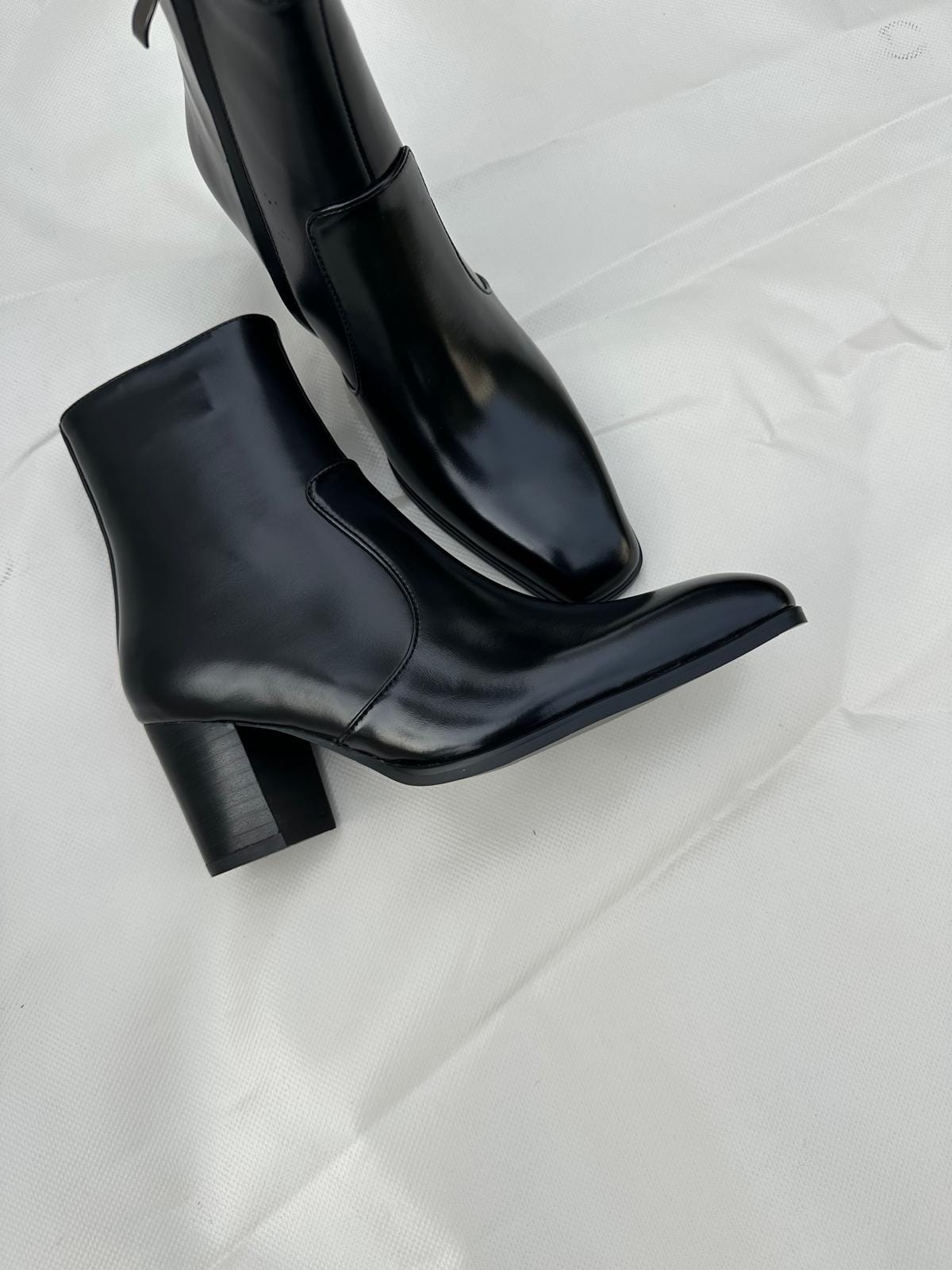 Bowie combines a glossy leather finish with an elongated square toe and a refined block heel, creating a silhouette that feels both striking and effortlessly sophisticated.