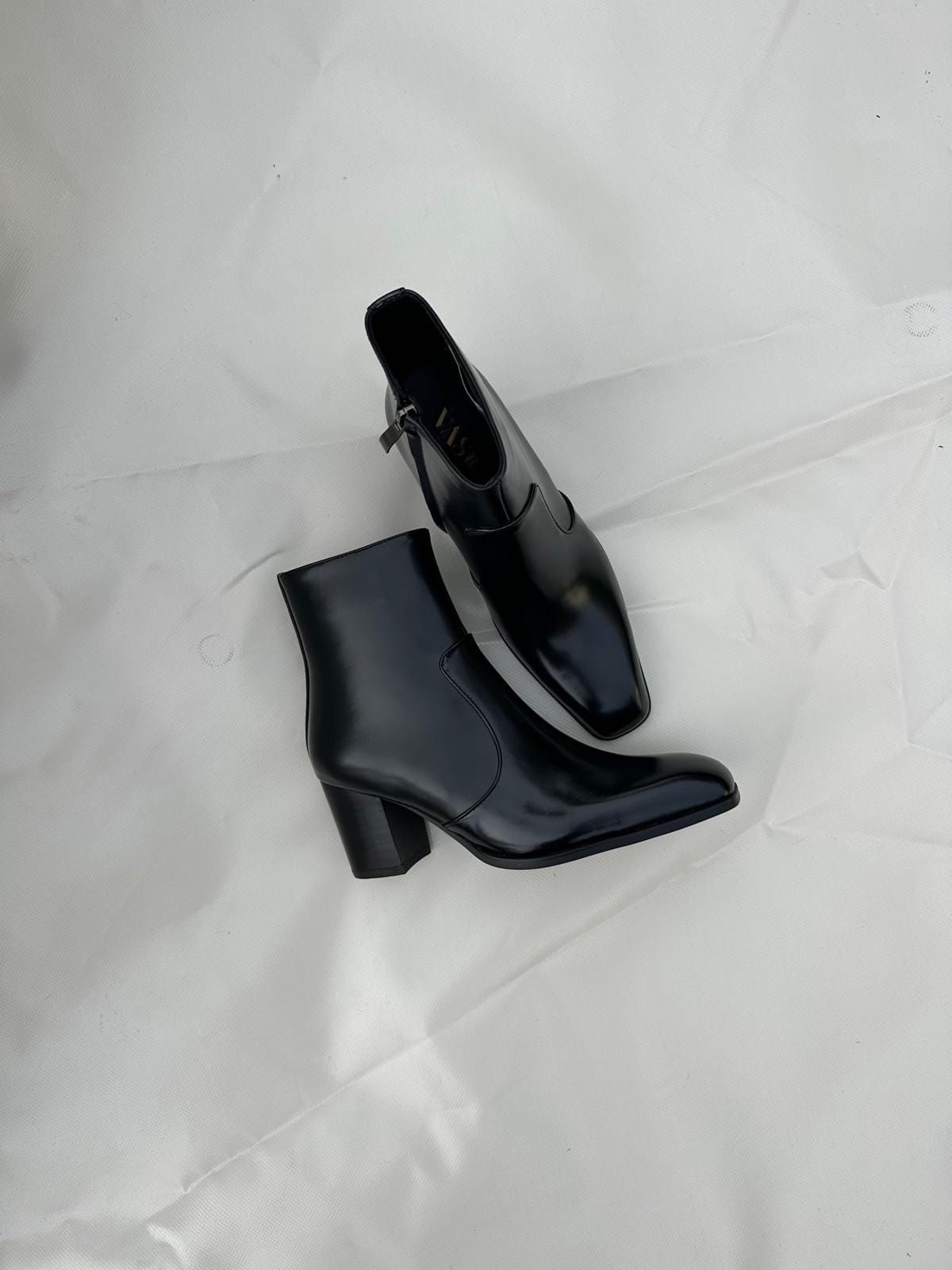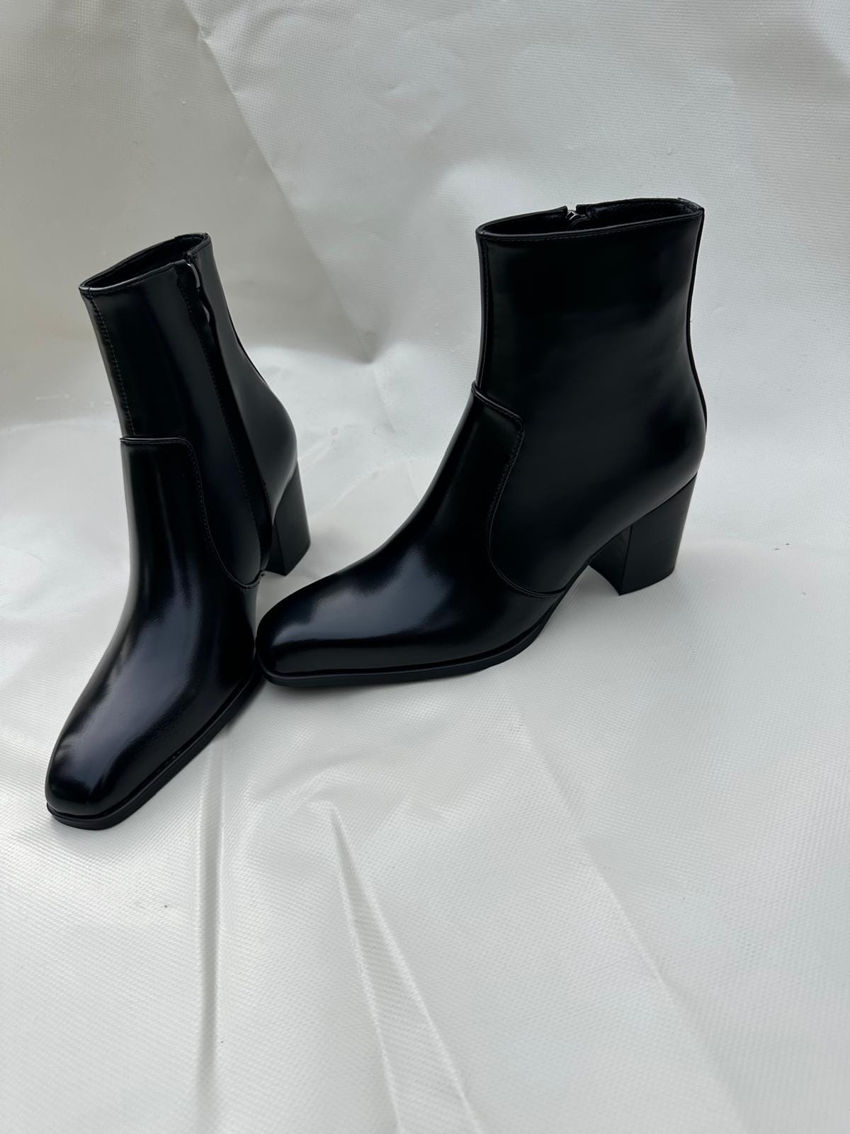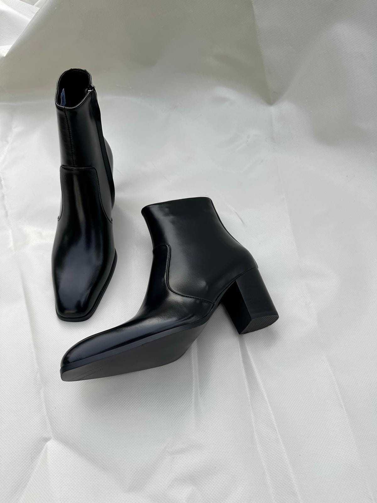 Bowie combines a glossy leather finish with an elongated square toe and a refined block heel, creating a silhouette that feels both striking and effortlessly sophisticated.