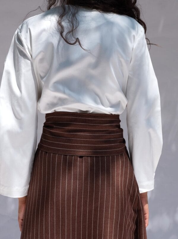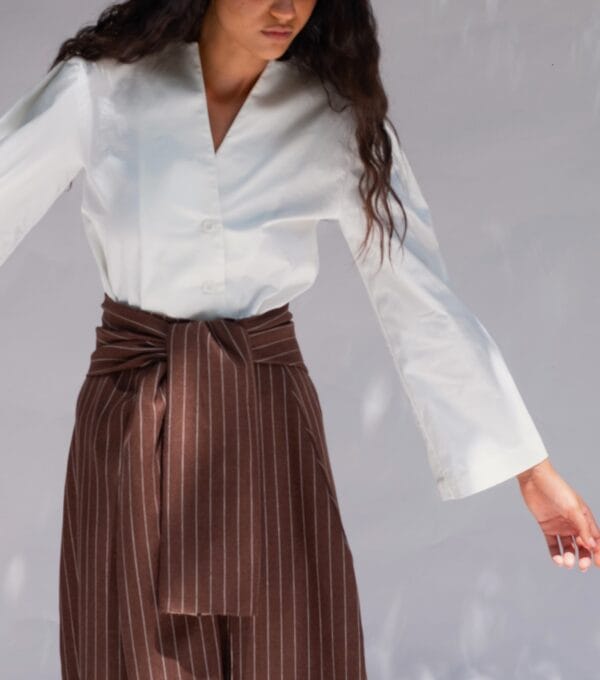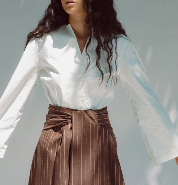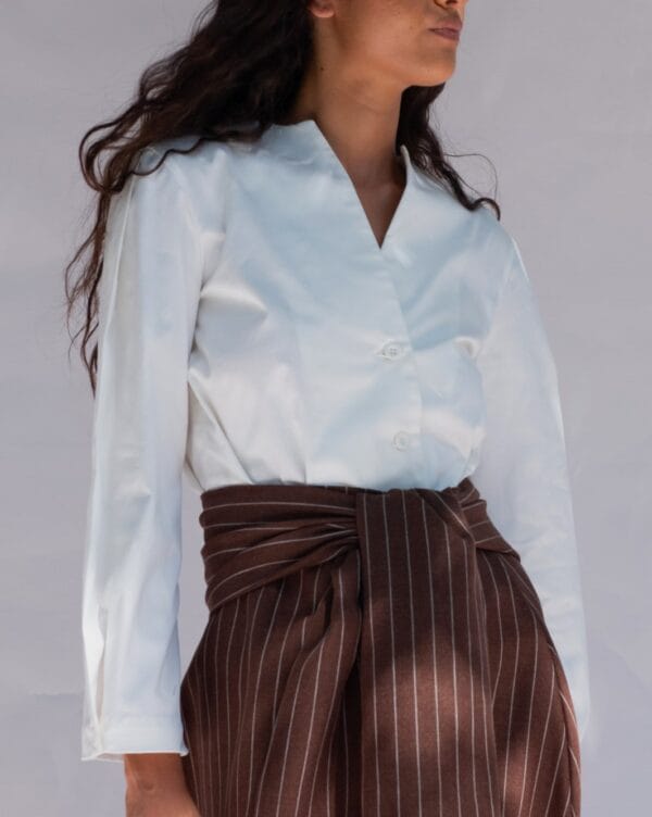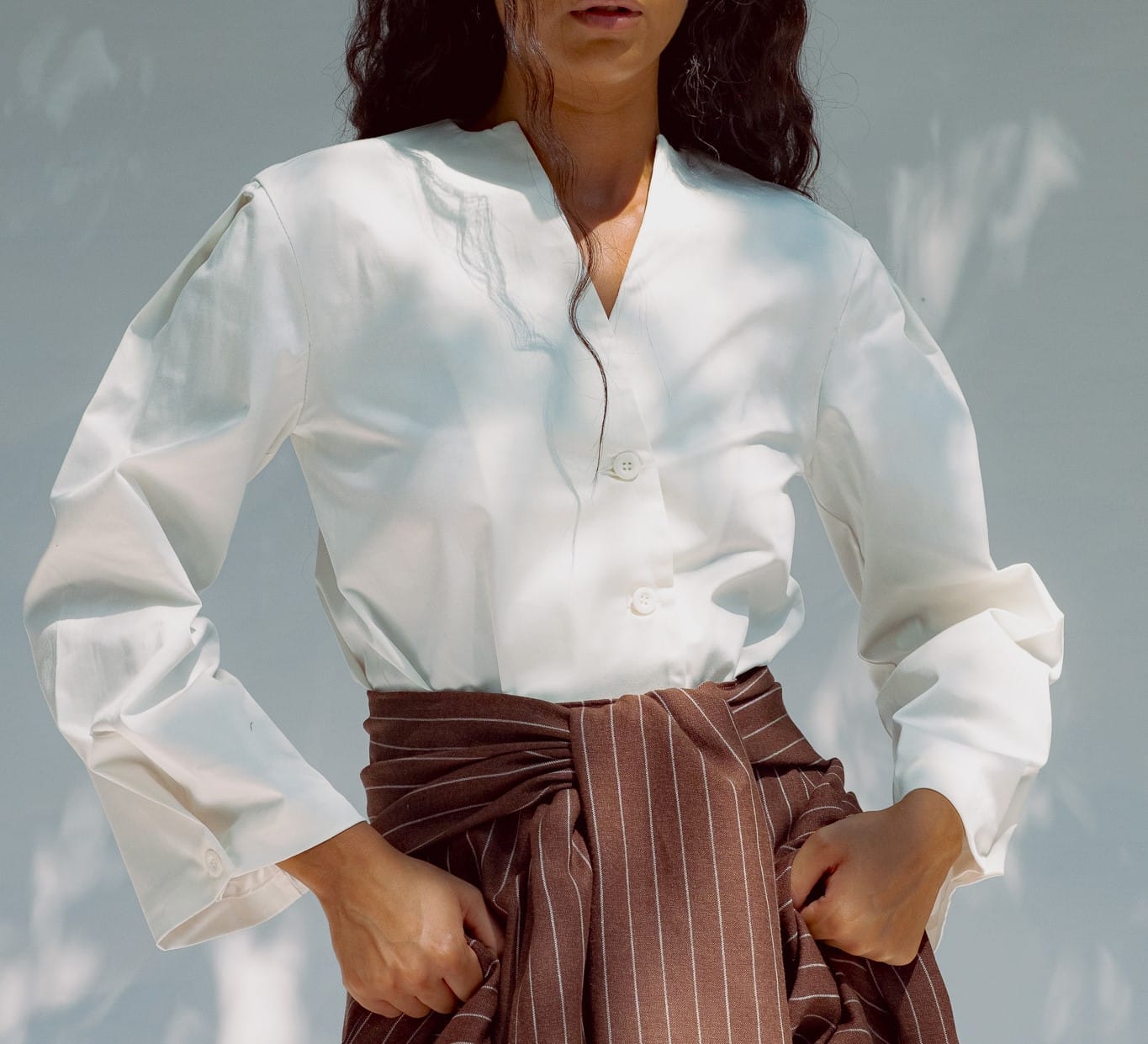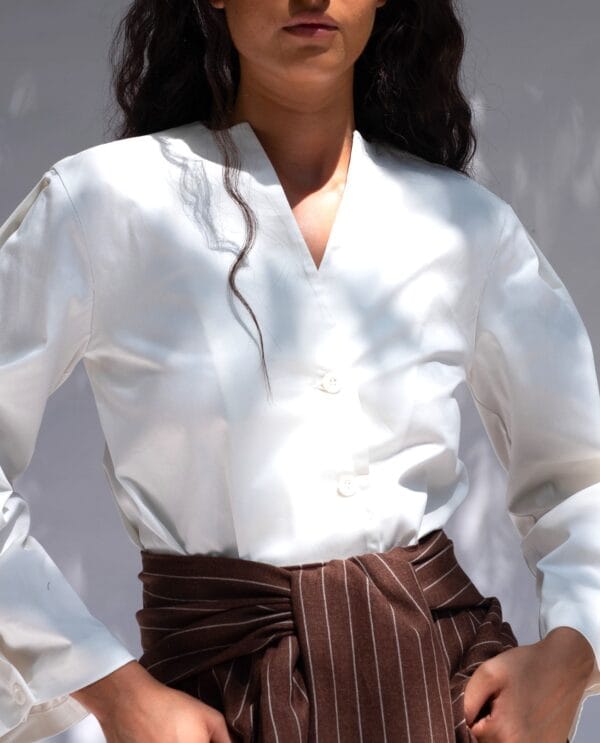 “Effortlessly modern, this blouse blends minimalist tailoring with subtle feminine detail.”