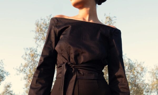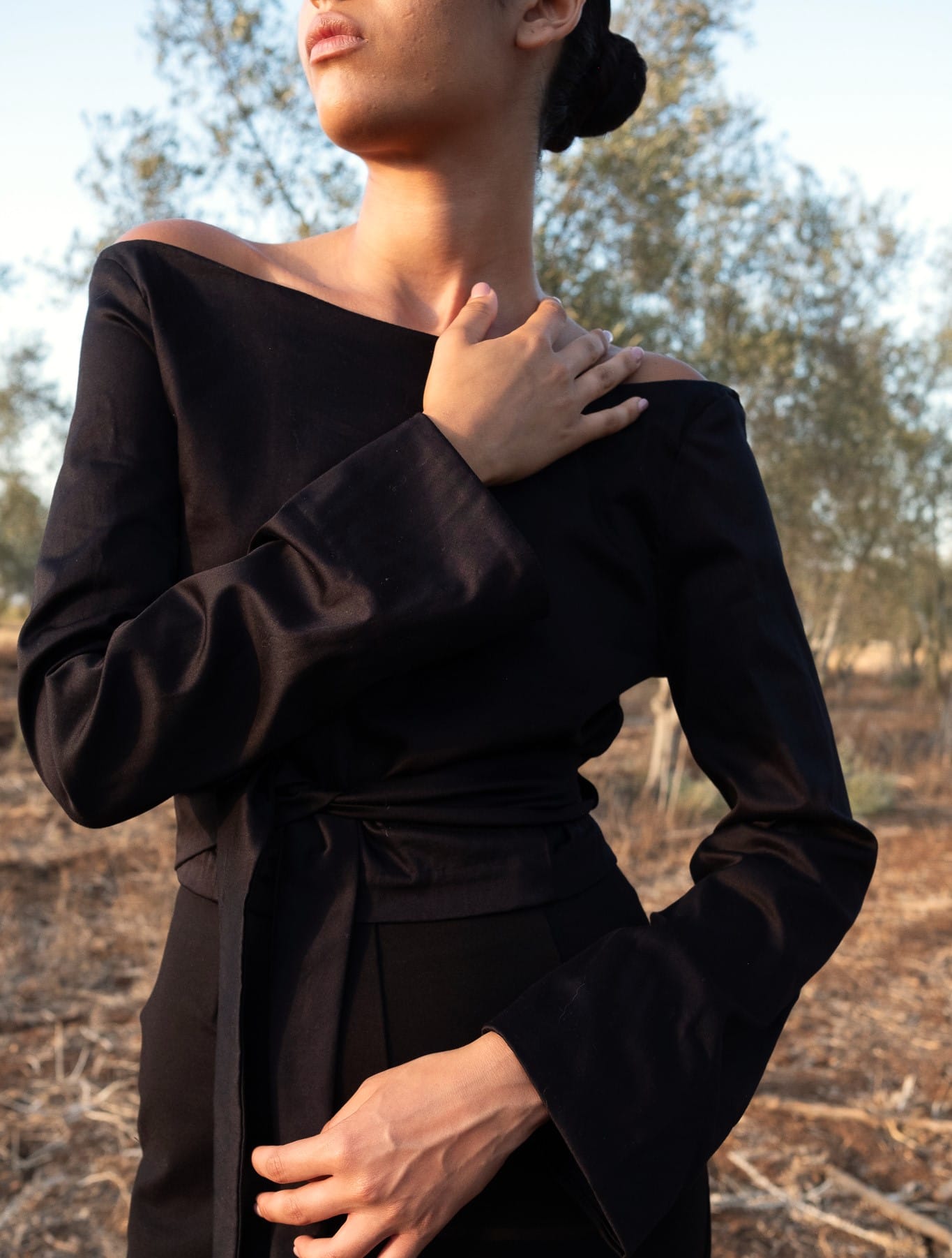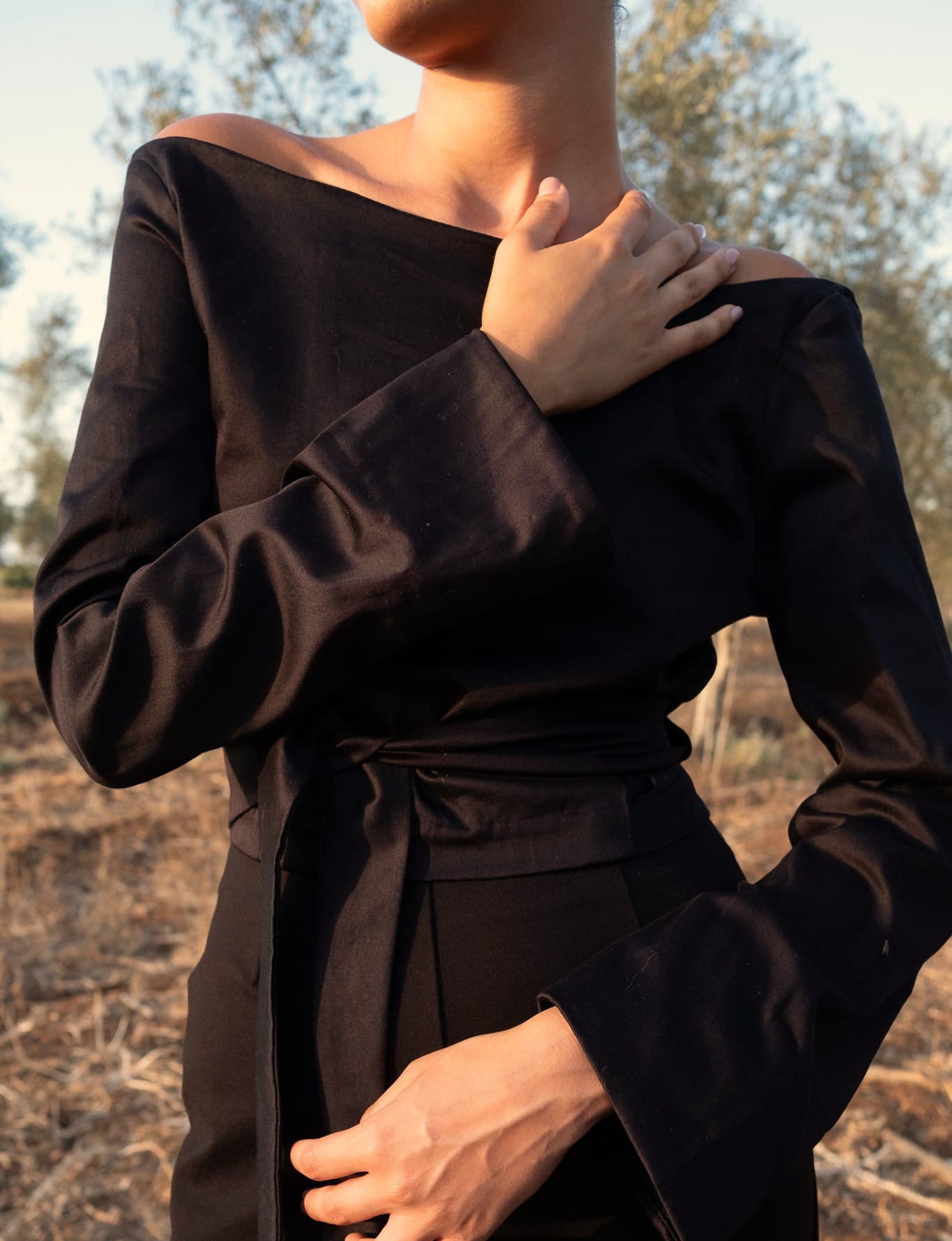 • Long sleeves with fluid drape