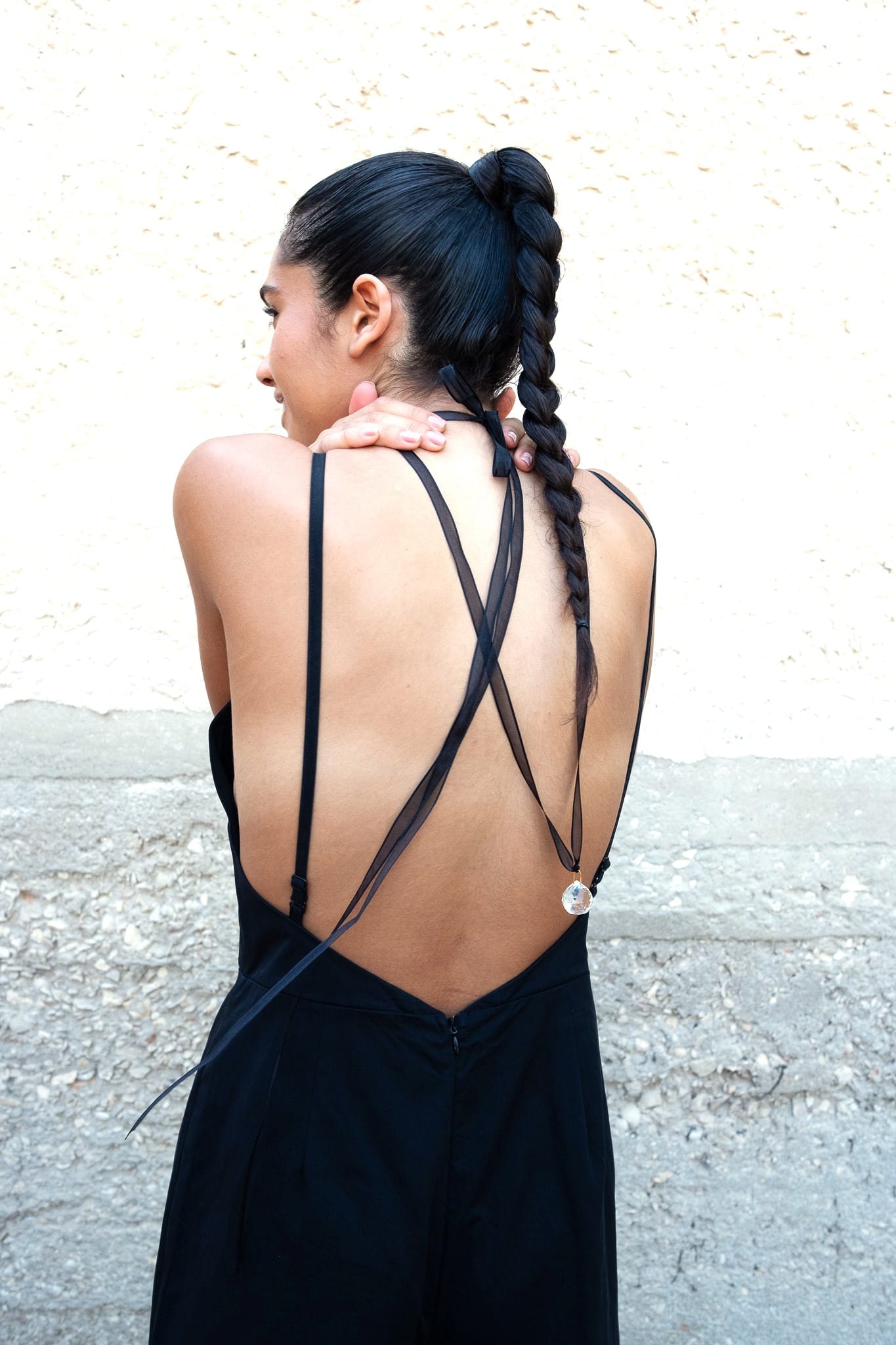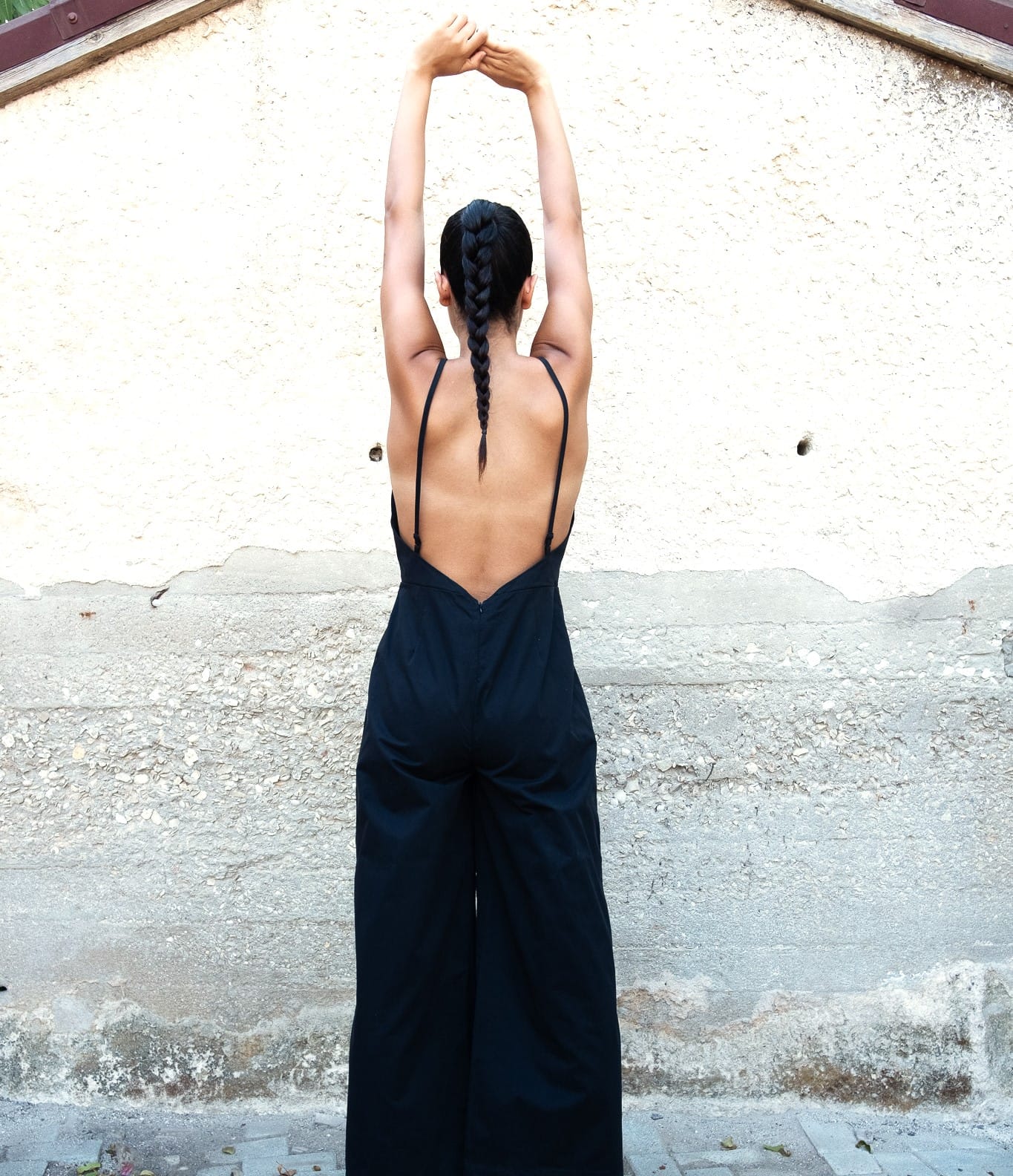 Cut from structured cotton, it features a plunging V-neckline and slim straps that frame the shoulders with ease. The wide-leg trousers create elongation, while the dramatic open back adds a sensual edge. A versatile statement piece that moves seamlessly from daywear with flats to evening elegance with heels.
