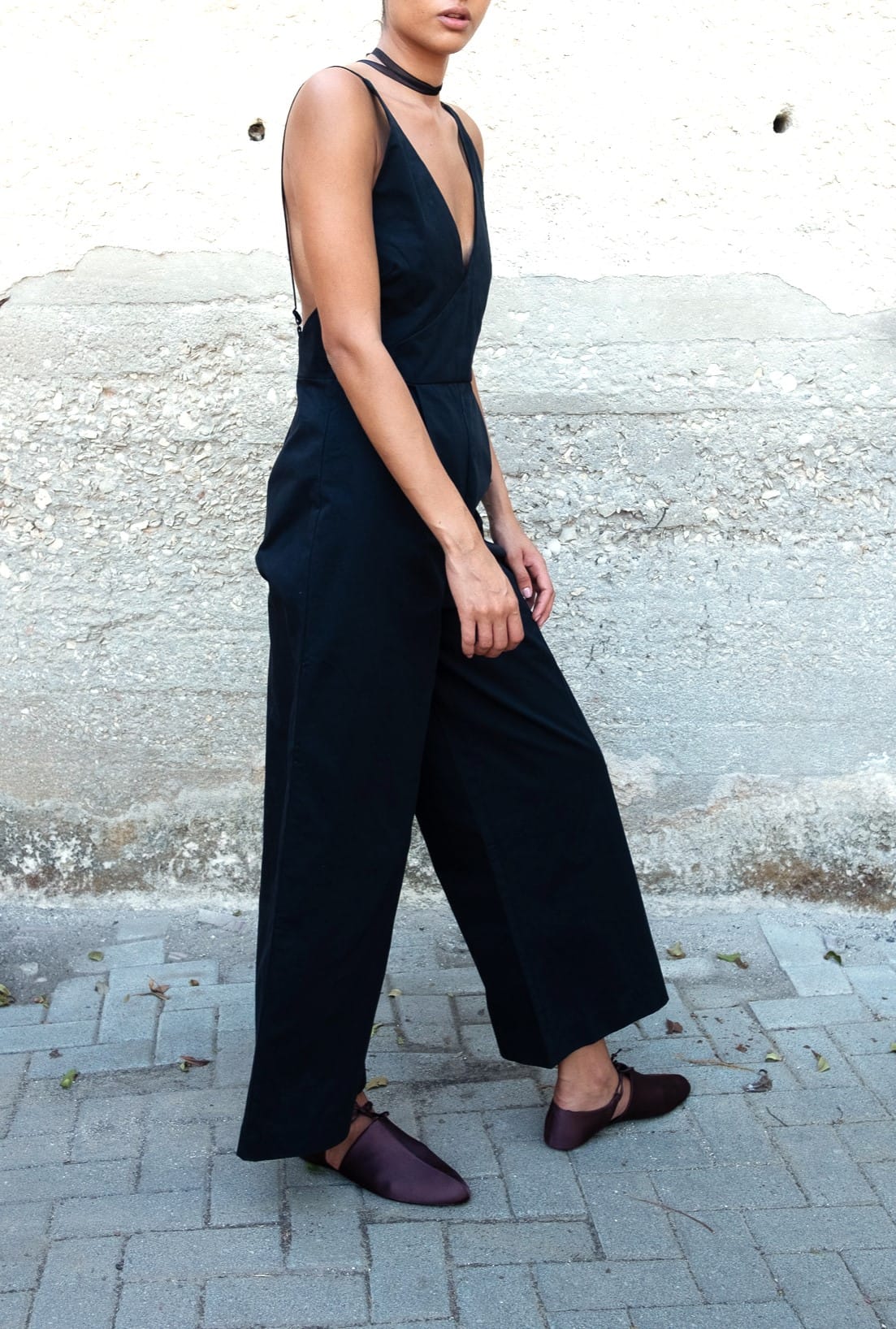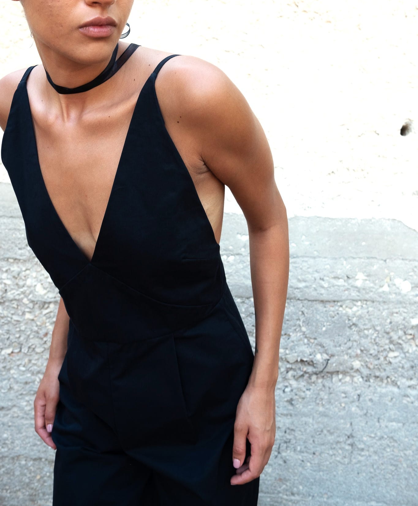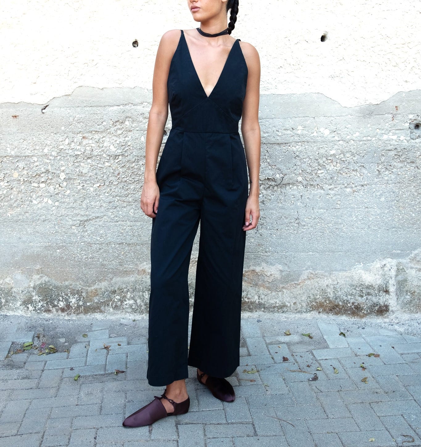 “Modern minimalism meets sensual edge in this structured cotton jumpsuit with plunging neckline and open back.”