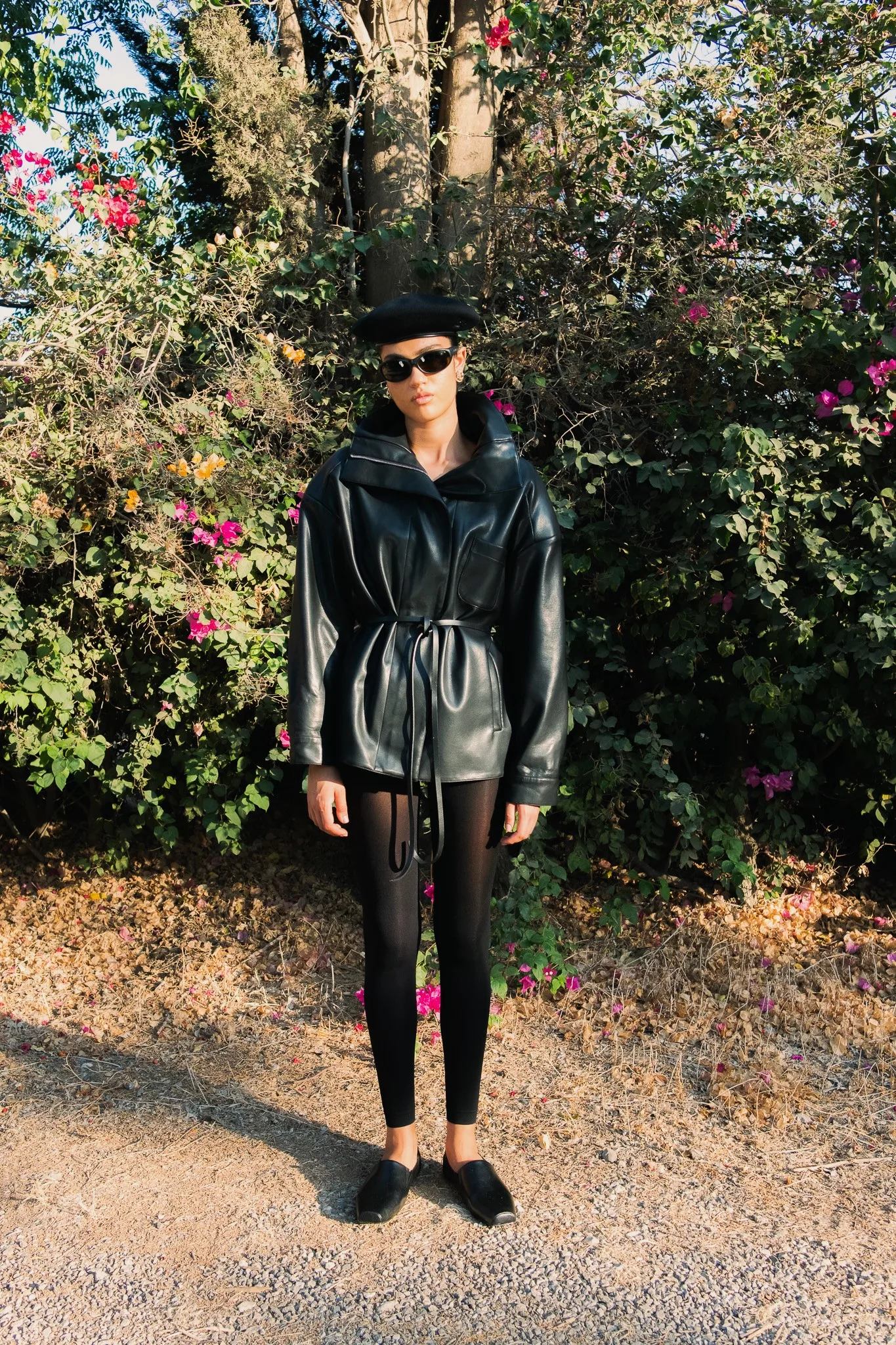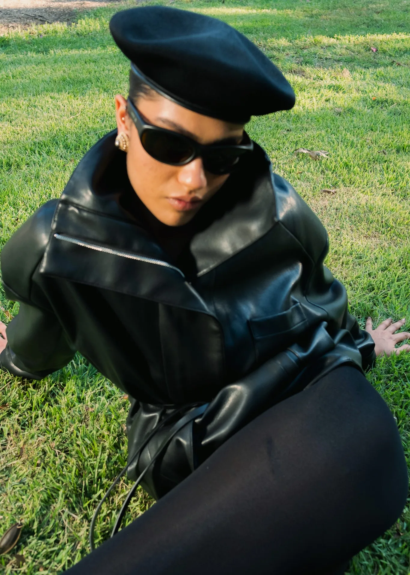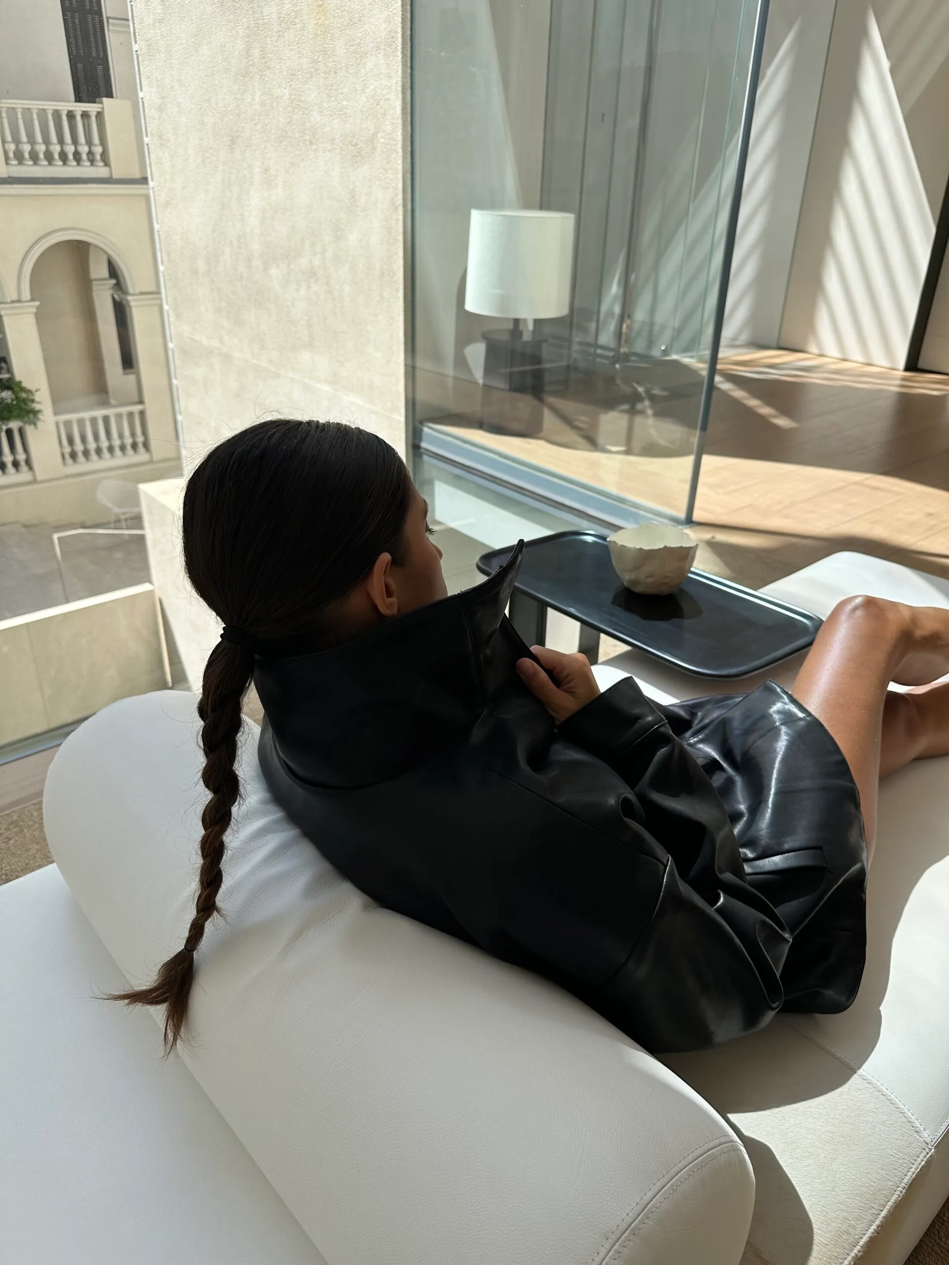 this oversized faux leather coat, crafted from high-quality vegan leather, complete with a sleek front zipper and a dramatic volume collar.”