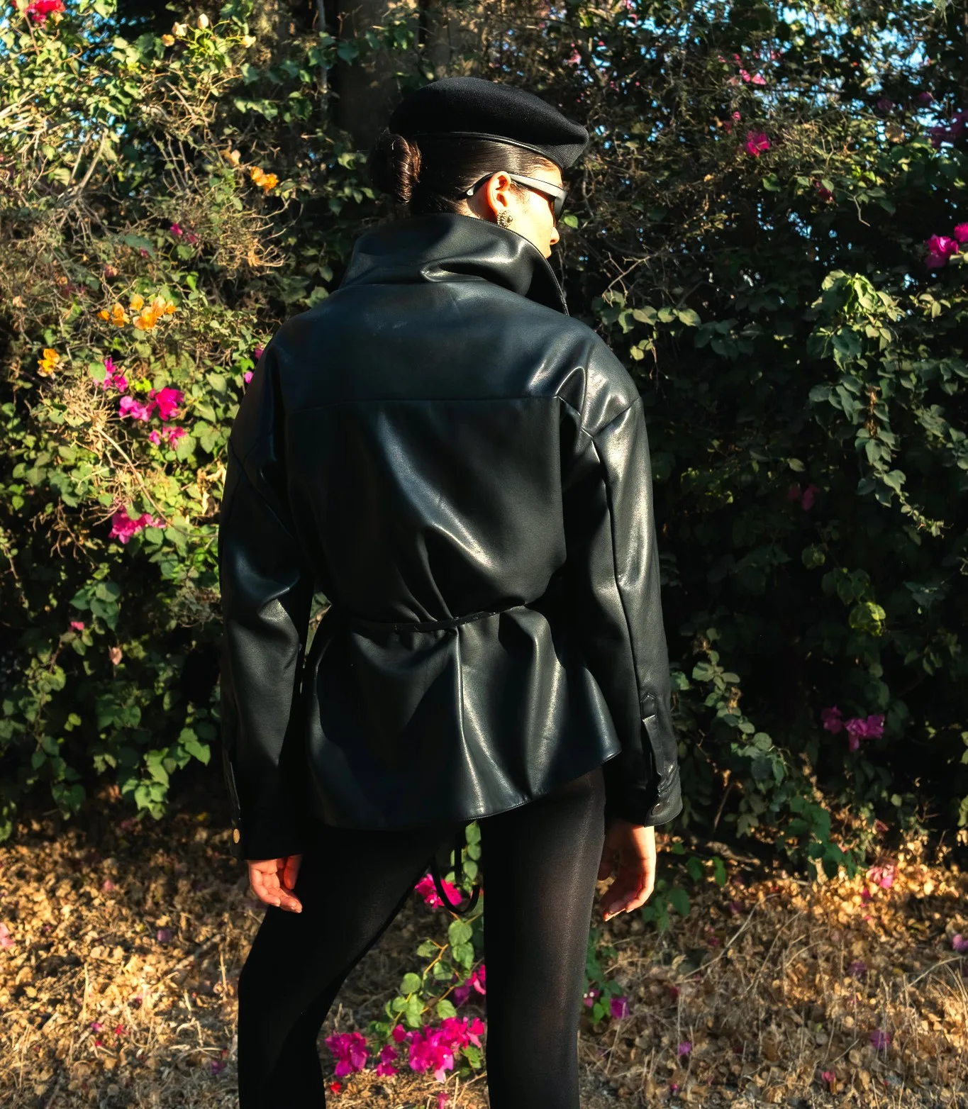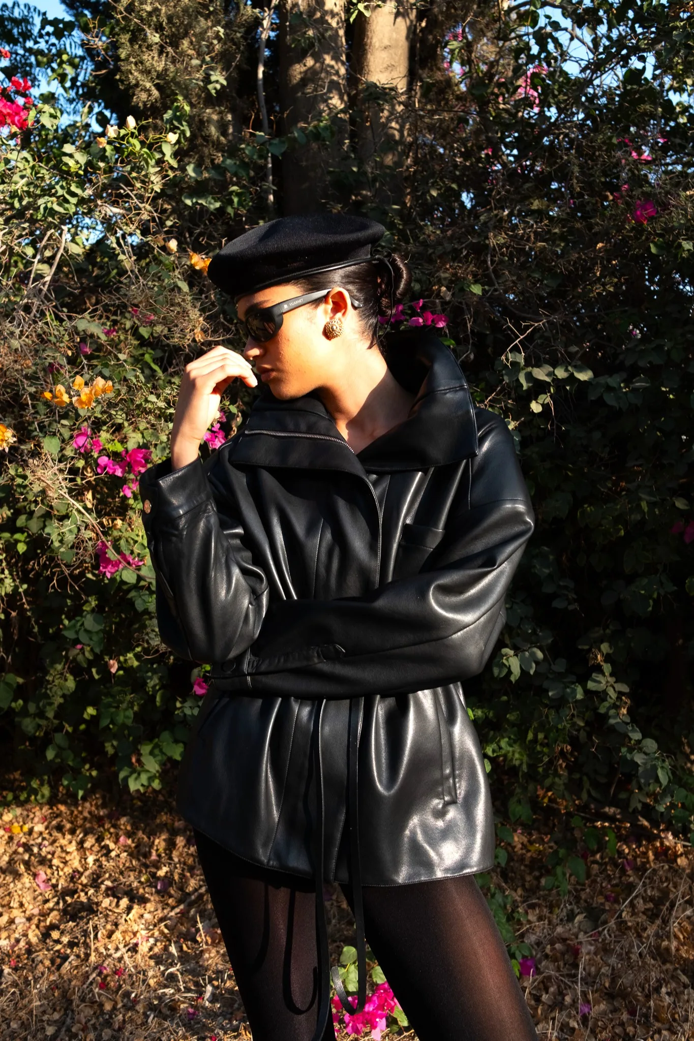 “Bold, edgy, and impossible to ignore: this oversized faux leather coat brings the cool factor to any outfit.”