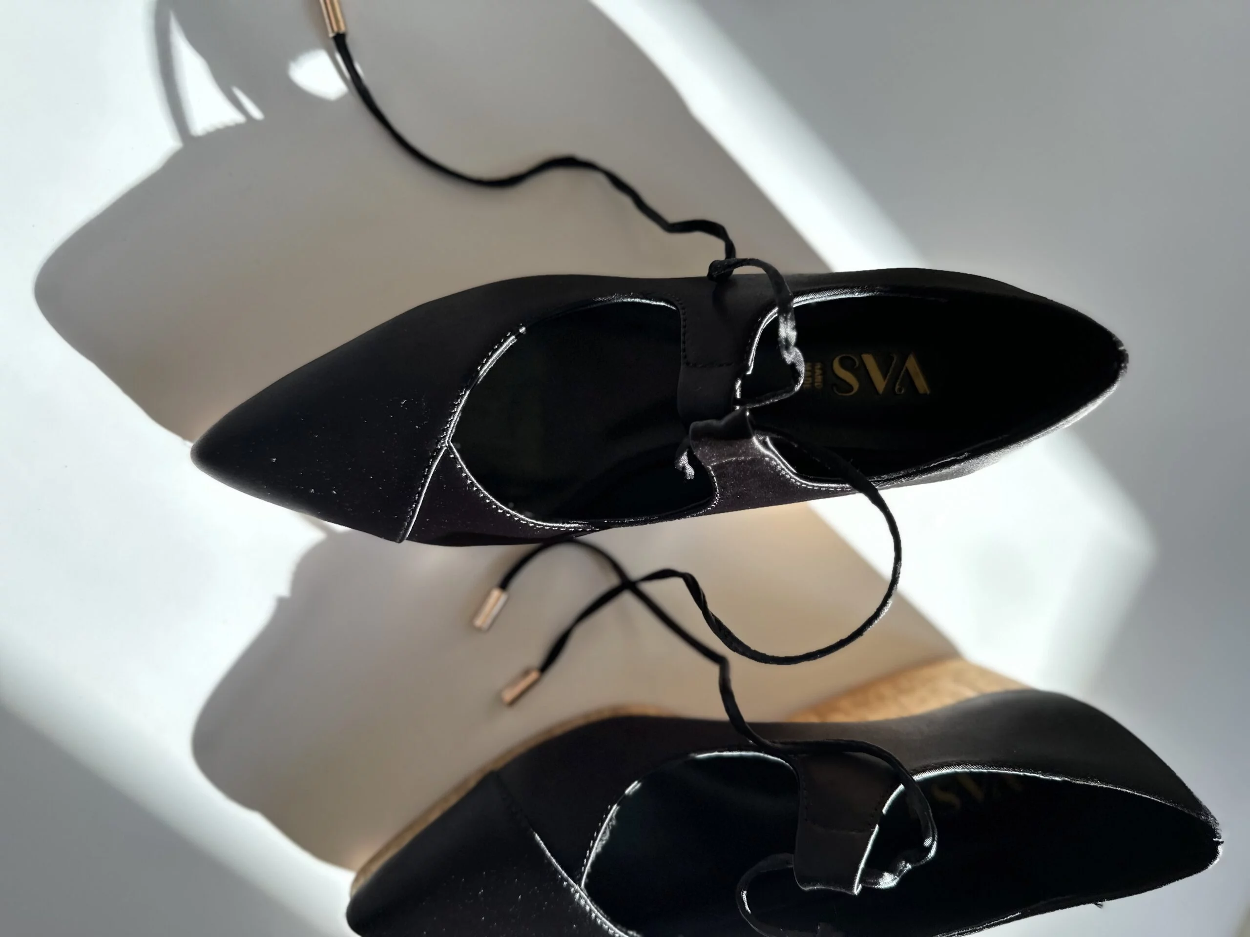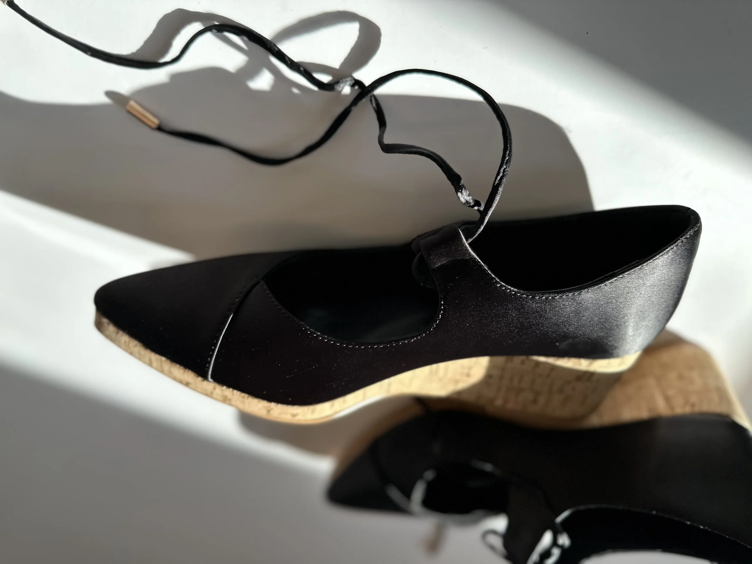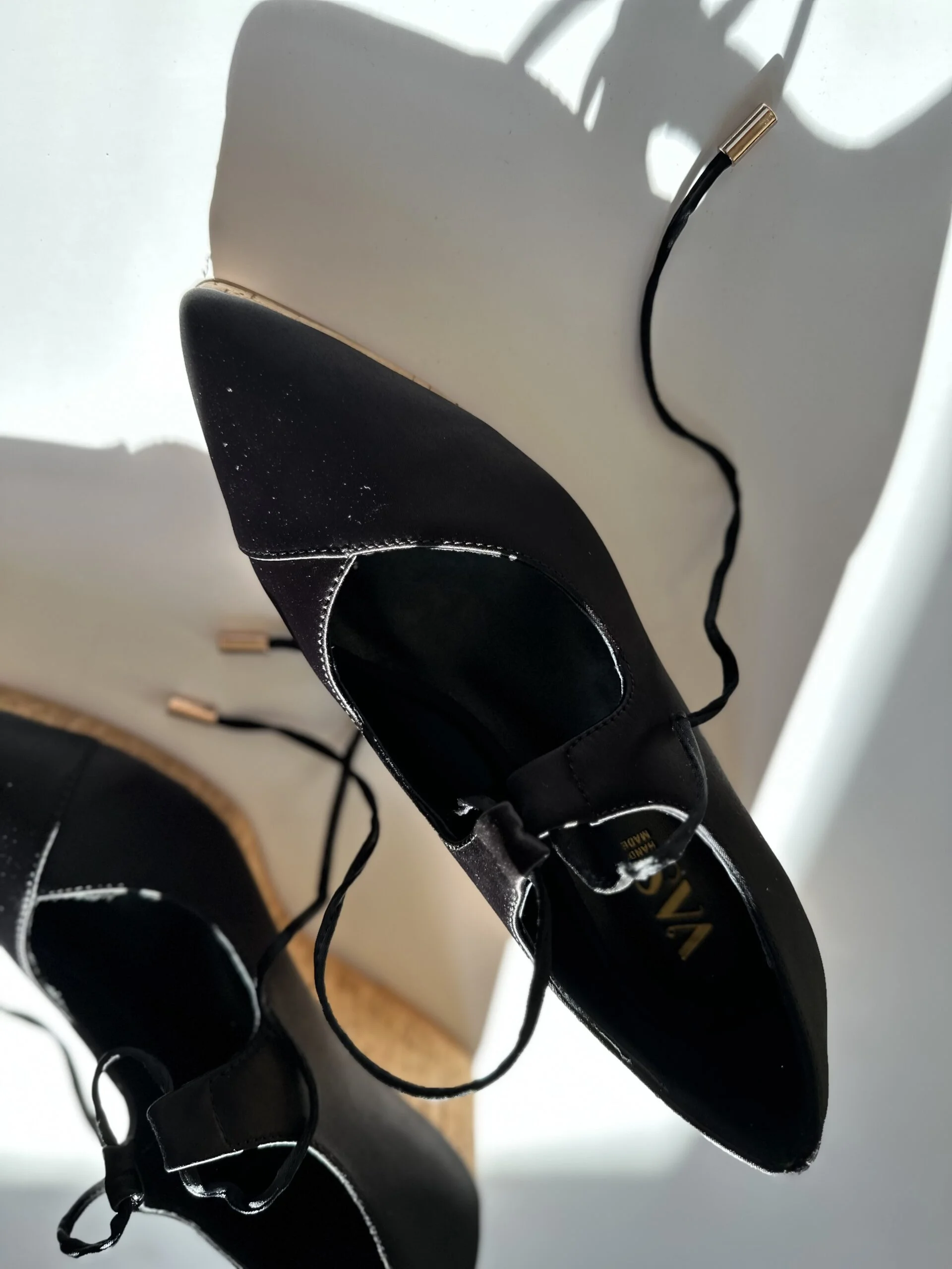 The special cut on the toes flatters the foot creating an elongated and narrow feminine silhouette crossed with adjustable thin and gentle satin ties for closing and maximum fitting.